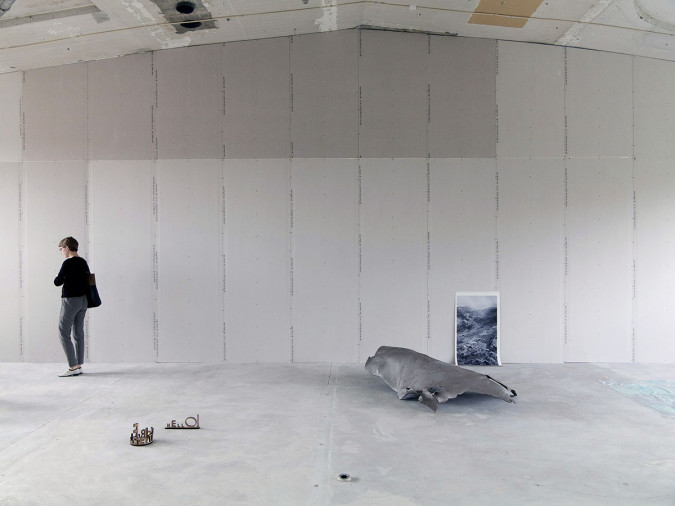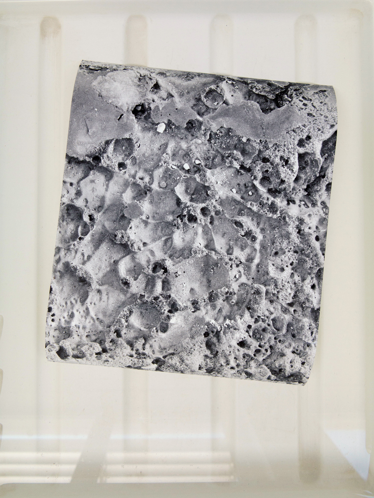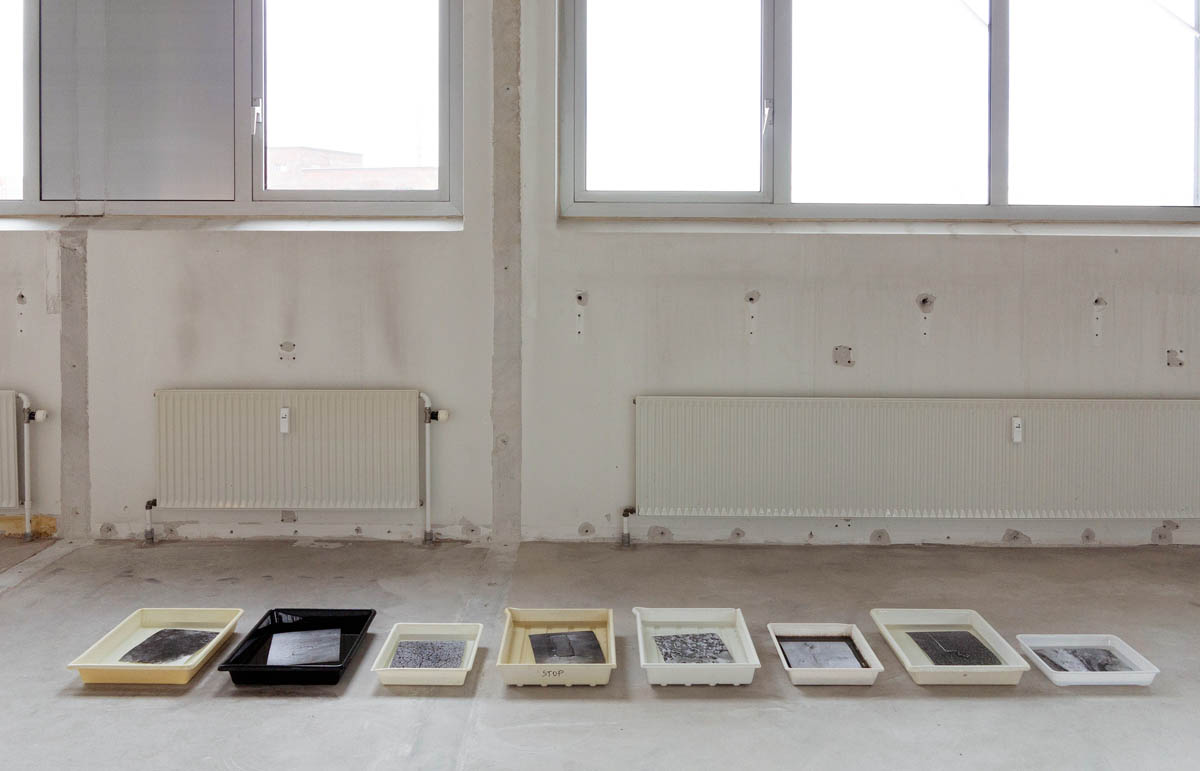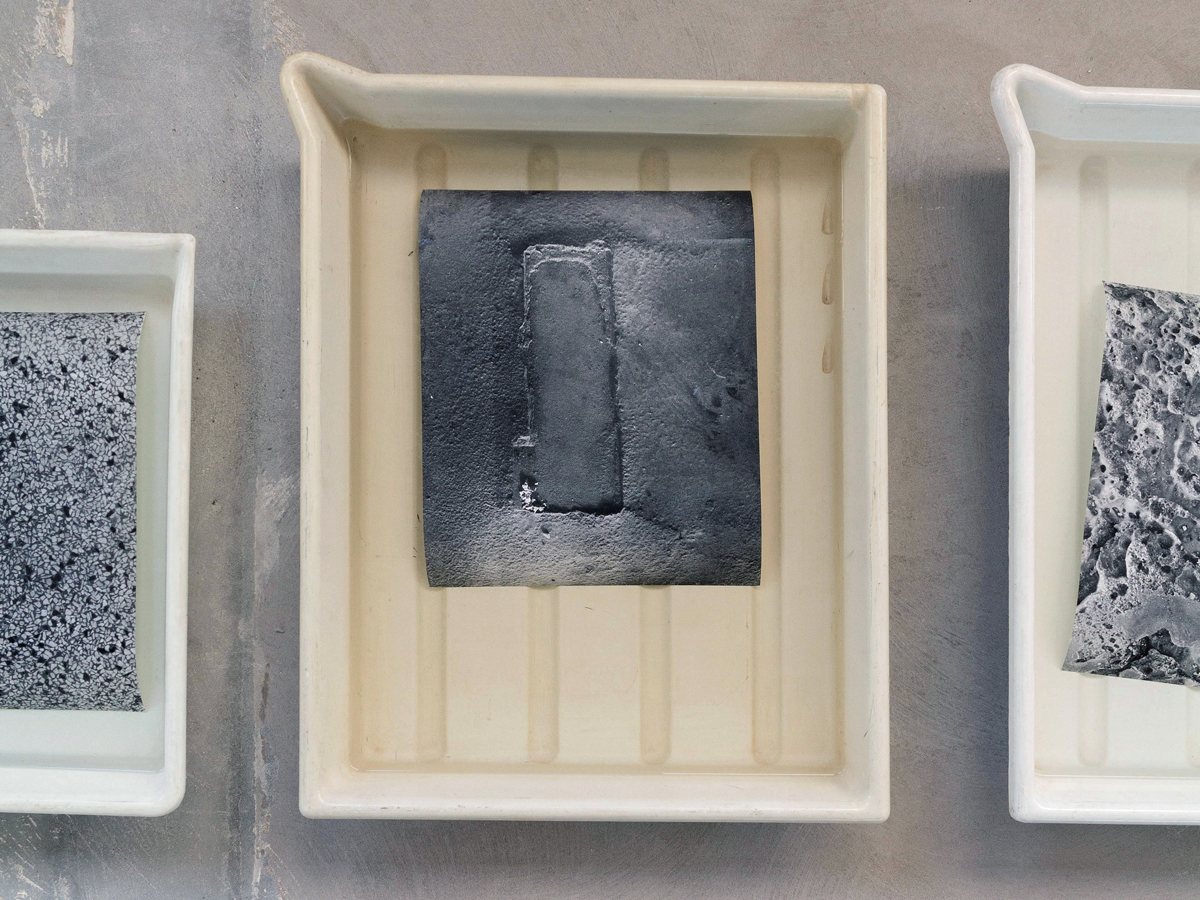 The work "Floorscapes" consists of black/white photos floating around in developing trays from the analogue darkroom. The motifs are sections of floors with traces from the former laboratory in the building on Sydhavnsgade 7.